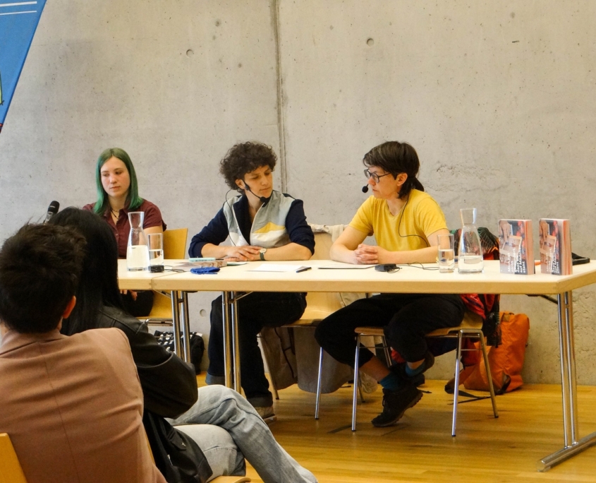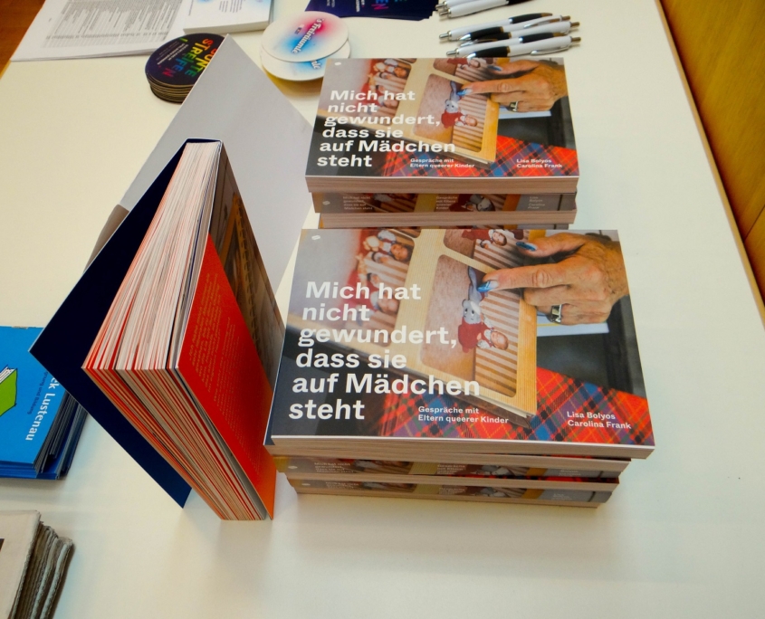 Zum anderen dürfte es für sehr viele aus unseren Reihen das erste Mal gewesen sein, dass sie an einer Lesung teilnahmen. Das neue Format war für viele unbekannt: Eine dialogische Lesung aus dem Buch „Mich hat nicht gewundert, dass sie auf Mädchen steht“ – durchgeführt von den beiden Autorinnen Lisa Bolyos und Carolina Frank höchstpersönlich; anschließend eine Frage- bzw. Diskussionsrunde zum gesellschaftlich kontroversen Thema des „Outings“ homosexueller Jugendlicher bzw. Erwachsener.