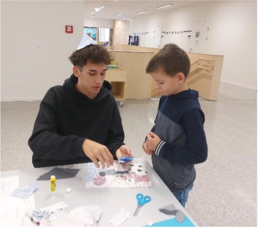 Anschließend durfte jedes Kind sich einen Leser bzw. eine Leserin auswählen. Während wir den Kindern das Buch „Arno der Flickenbär“ vorgelesen haben, hörten die Kleinen gespannt zu. Daraufhin wurde gemeinsam mit dem Lesepaten ein Flickenbär, also Arno, gezeichnet und mit Stoffflicken beklebt.