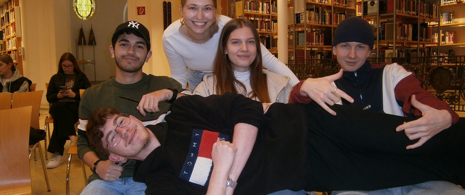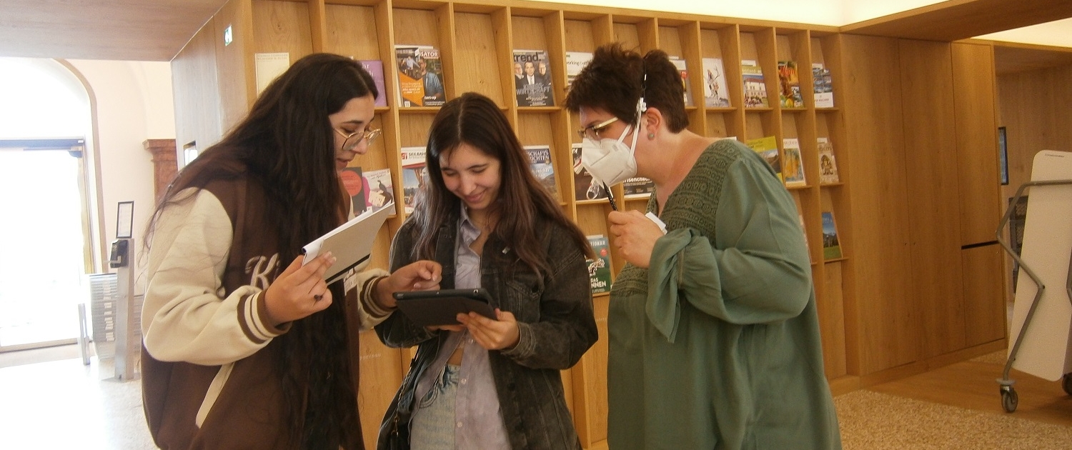 Gleich wurden wir von Frau Melitta Schwarzmann in Empfang genommen, die uns auch später sehr nützliche Tipps auf den Weg mitgab. In der beeindruckenden Landesbibliothek wartete schon eine Präsentation über die richtige Nutzung der zur Verfügung gestellten Bücher, Links und Videos auf uns. Nach dem ausführlichen Vortrag, bei dem wir viele neue Erkenntnisse gewonnen haben, durften wir selbst in die große Bibliothek losziehen. Die über 600.000 Bücher haben uns schon ganz schön fasziniert. Zum Recherchieren für unsere anstehende Diplomarbeit durften wir Tablets ausleihen oder uns an die dort vorhandenen Computer setzen. Außerdem wurde uns geschildert, wie wichtig es ist, die richtigen Quellen zu finden.